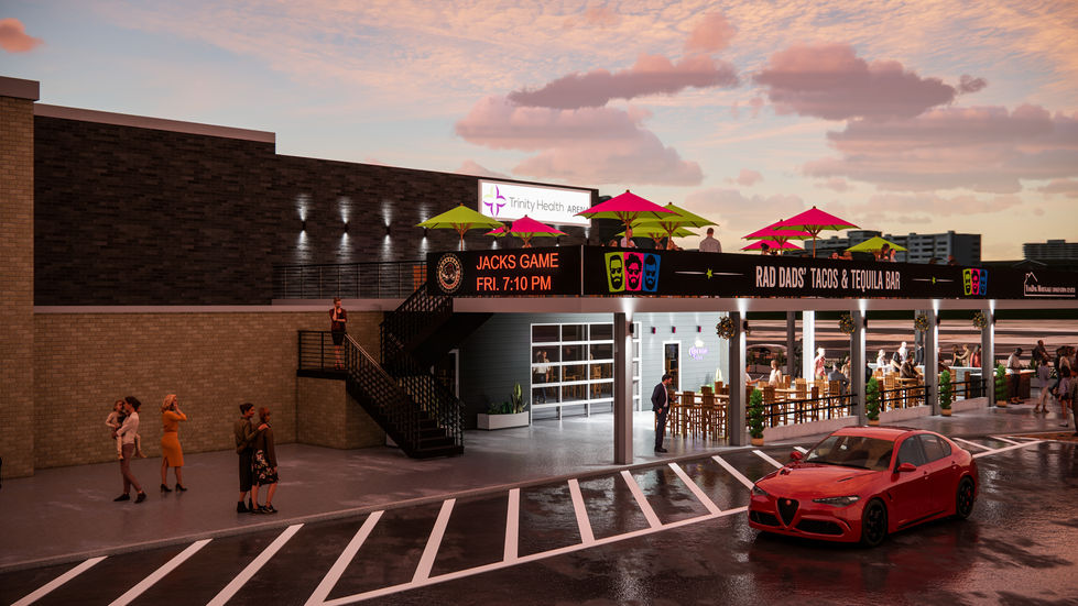 Visualizing Venue Activation. Produced to secure financing and approvals, this rendering showcases the vibrant expansion of Rad Dads' Tacos. It highlights the patio activation and branding integration at the Trinity Health Arena entrance, proving the concept's value to investors.